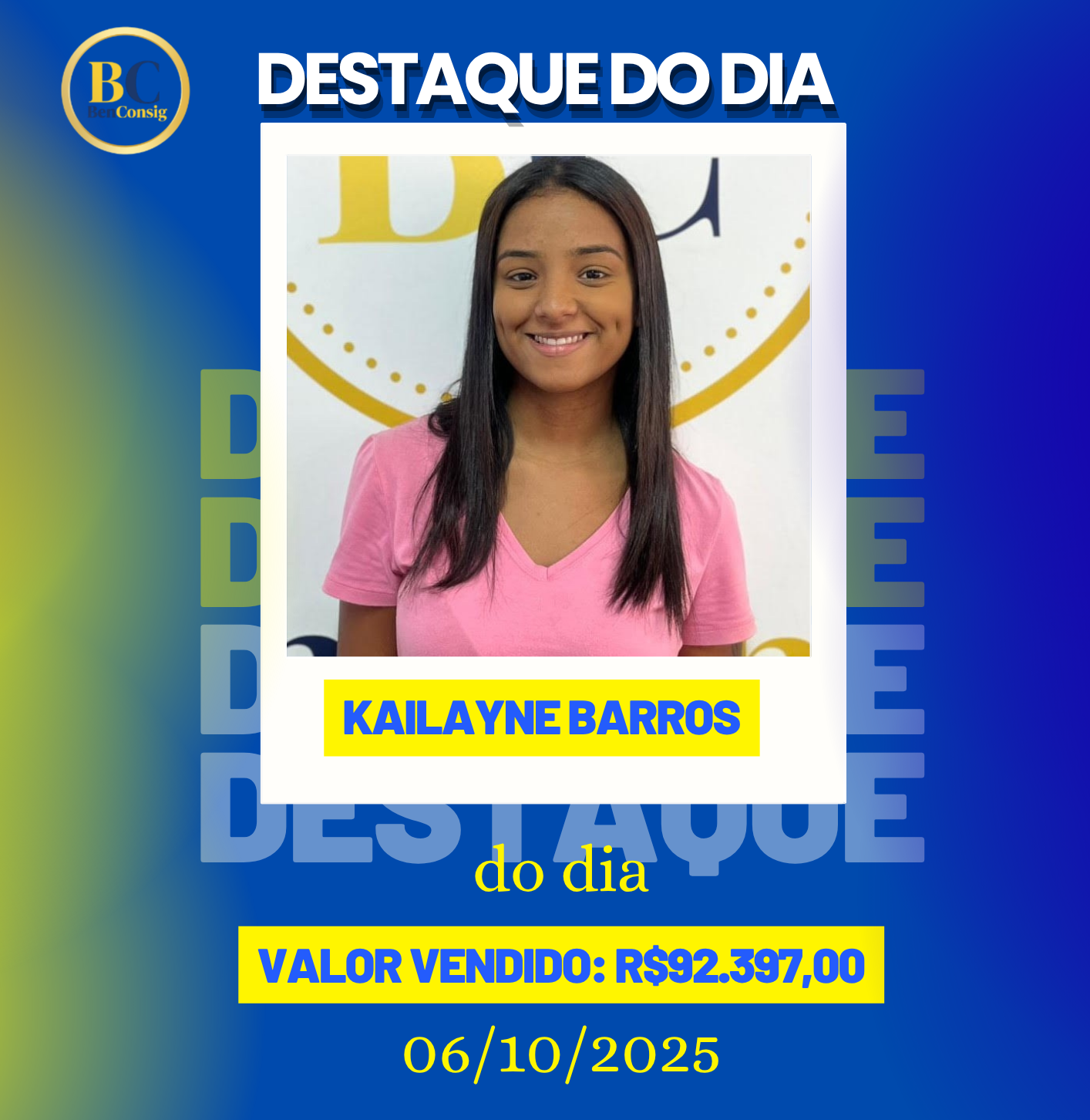 Parabéns, Kailayne Barros! 👏 Pelo segundo dia consecutivo, você brilha como Destaque do Dia, alcançando um resultado incrível de R$ 92.397,00 em vendas! 💰🔥